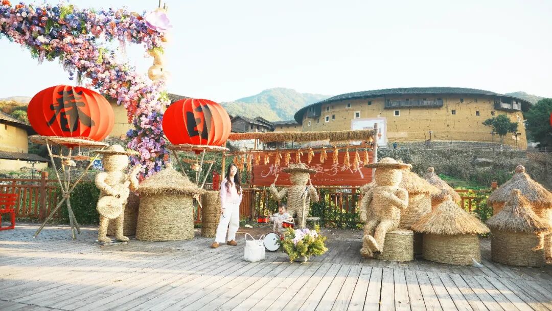 踏入初溪,目之所及皆是新春与春日交织的惊喜。初溪文化广场打卡点,灵动的稻草人乐队与错落的土楼群相映成趣,新年里站在这里打卡,一帧一画都是土楼新春与春日盛景的同框,定格独属于永定土楼的新年记忆。