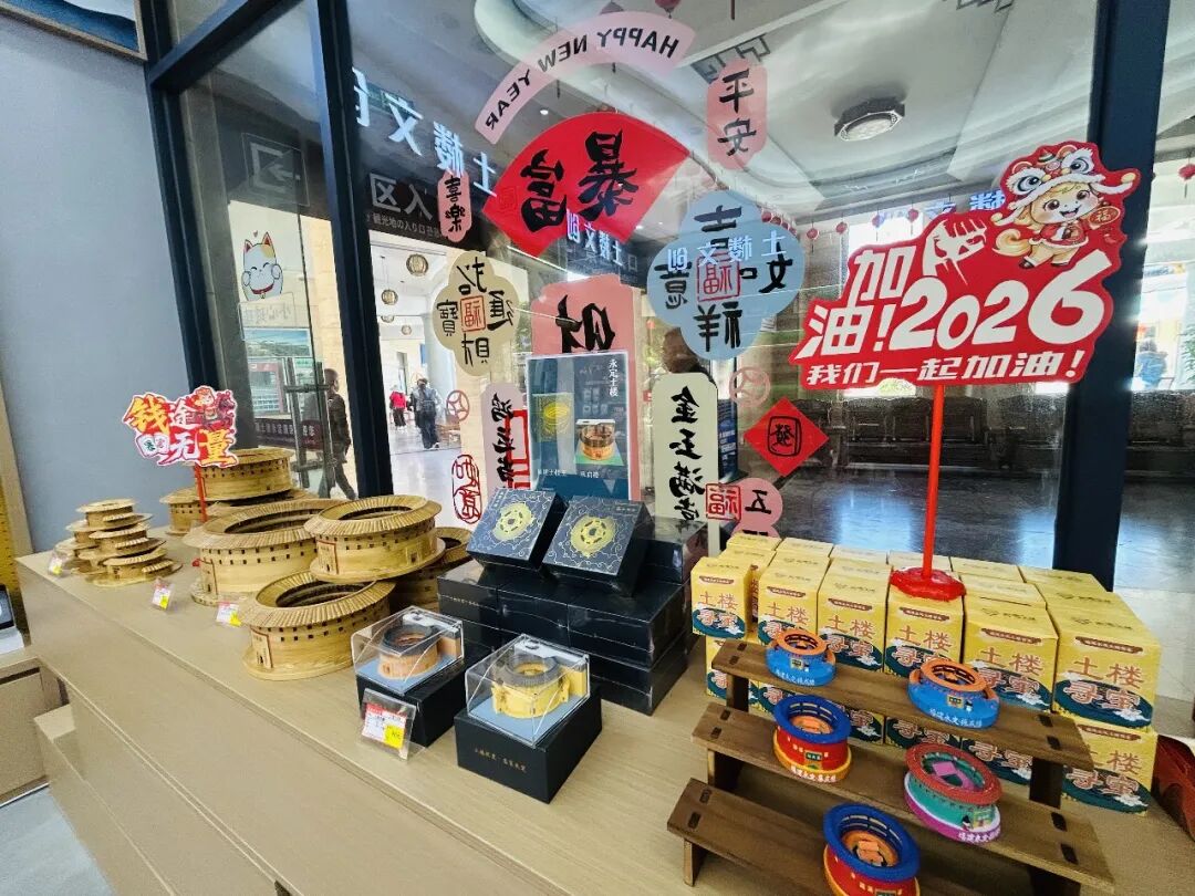走进福建土楼永定景区的文创空间,“土楼文创”四个大字醒目亮眼,目之所及皆是红火与欢喜。2026马年专属装饰早已就位,“马上有钱”的立牌讨彩头,“鸿运当头”的摆件添喜气,“你好2026”的祝福标语,将新年的期许写满每一个角落。