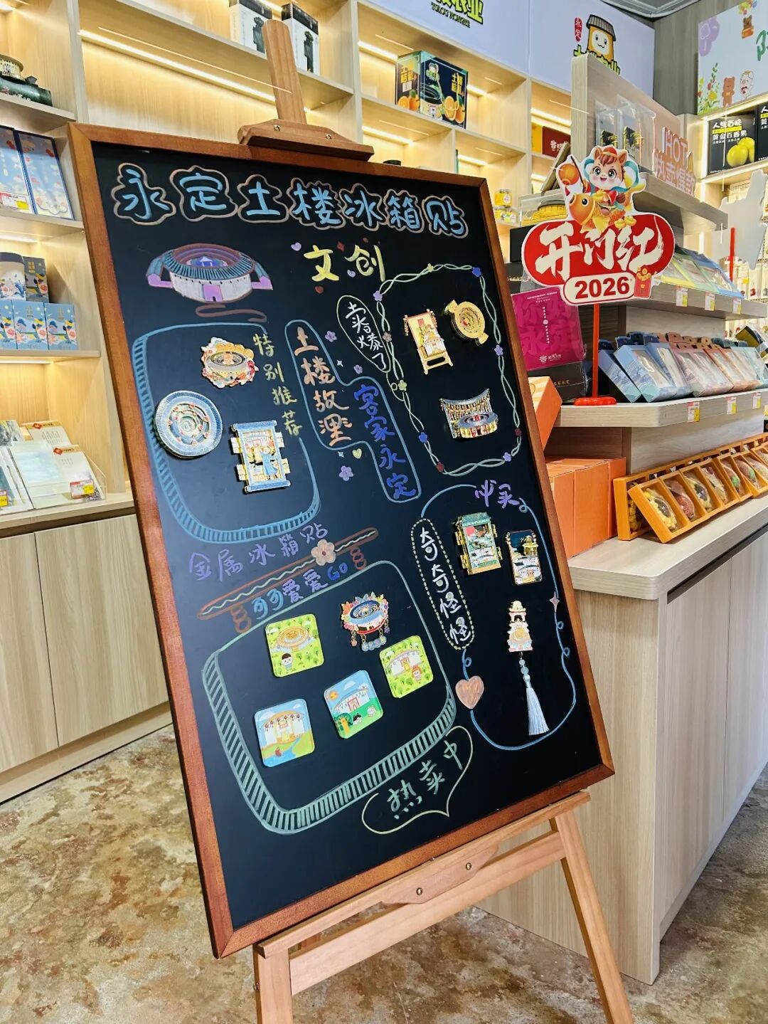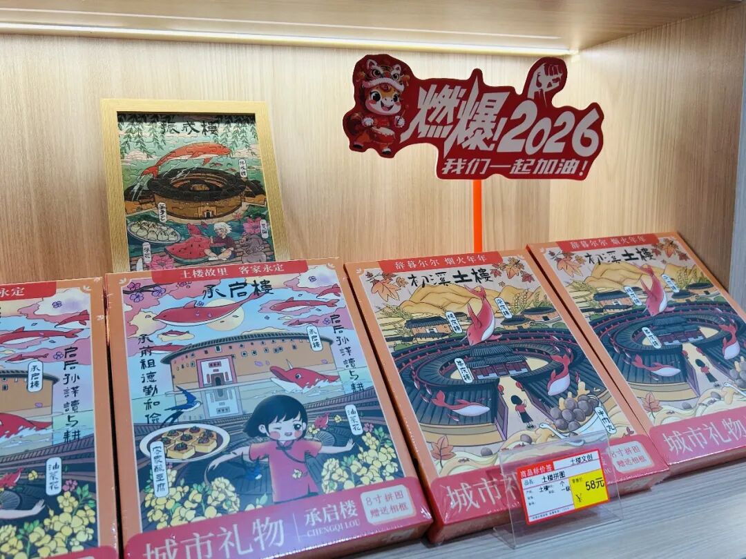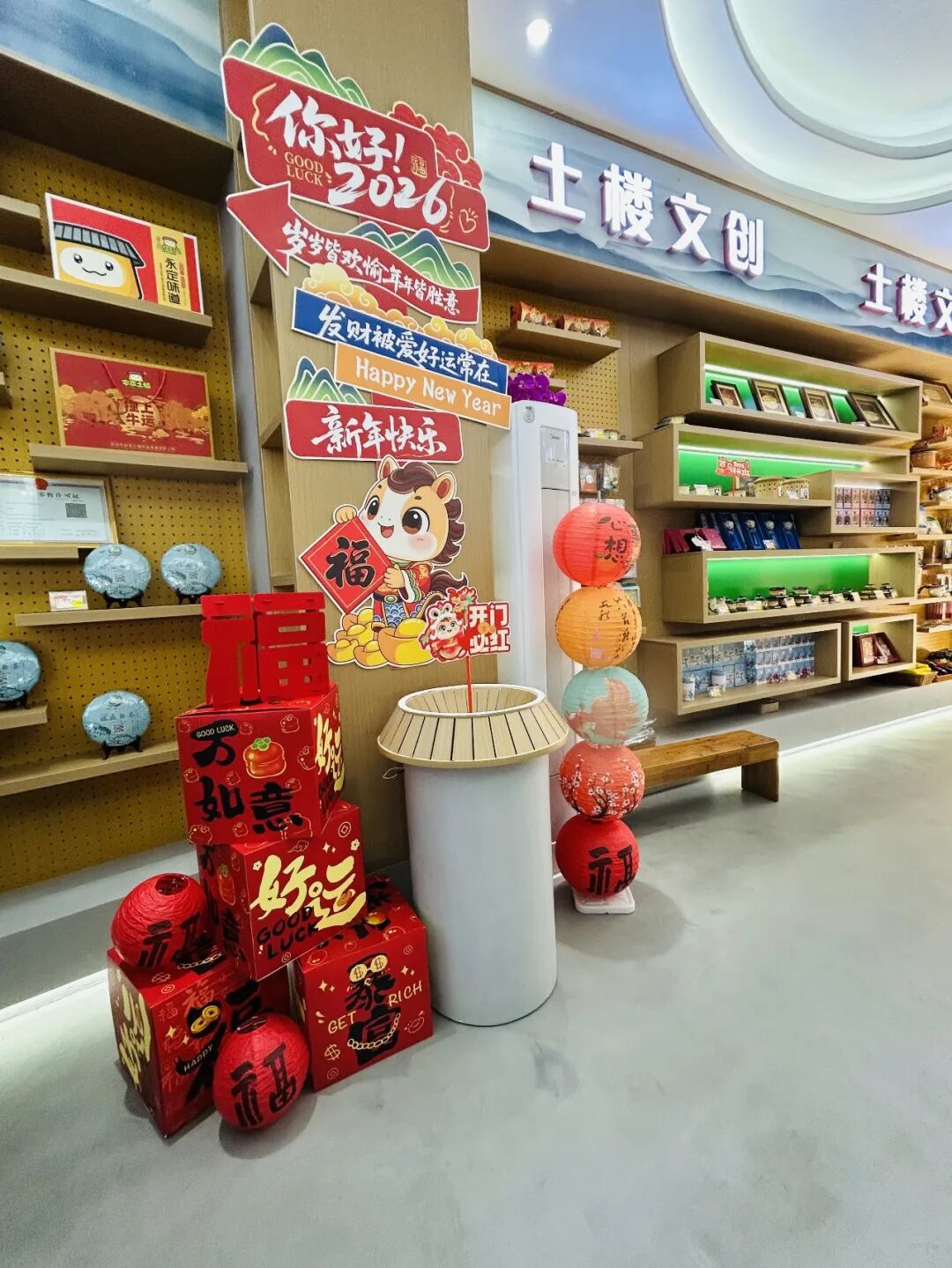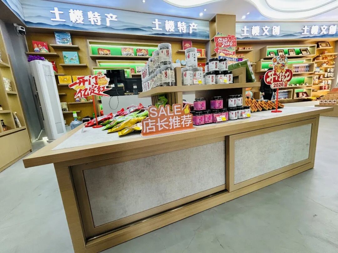 走进福建土楼永定景区的文创空间,“土楼文创”四个大字醒目亮眼,目之所及皆是红火与欢喜。2026马年专属装饰早已就位,“马上有钱”的立牌讨彩头,“鸿运当头”的摆件添喜气,“你好2026”的祝福标语,将新年的期许写满每一个角落。
